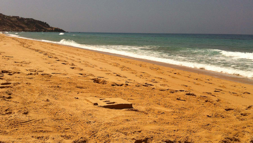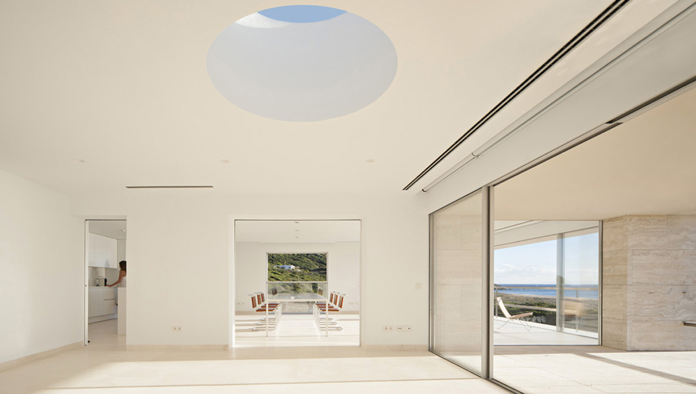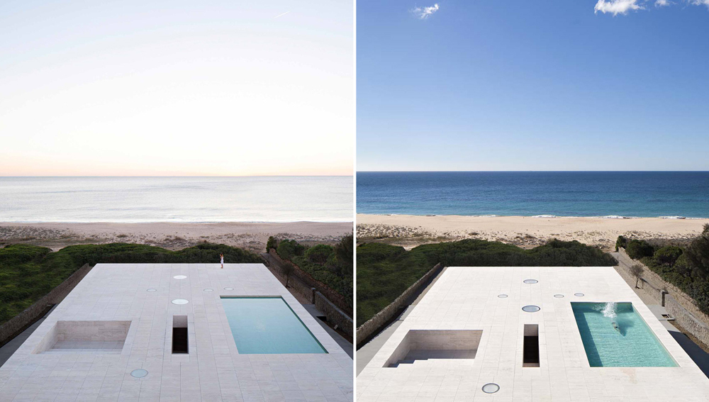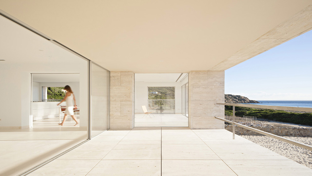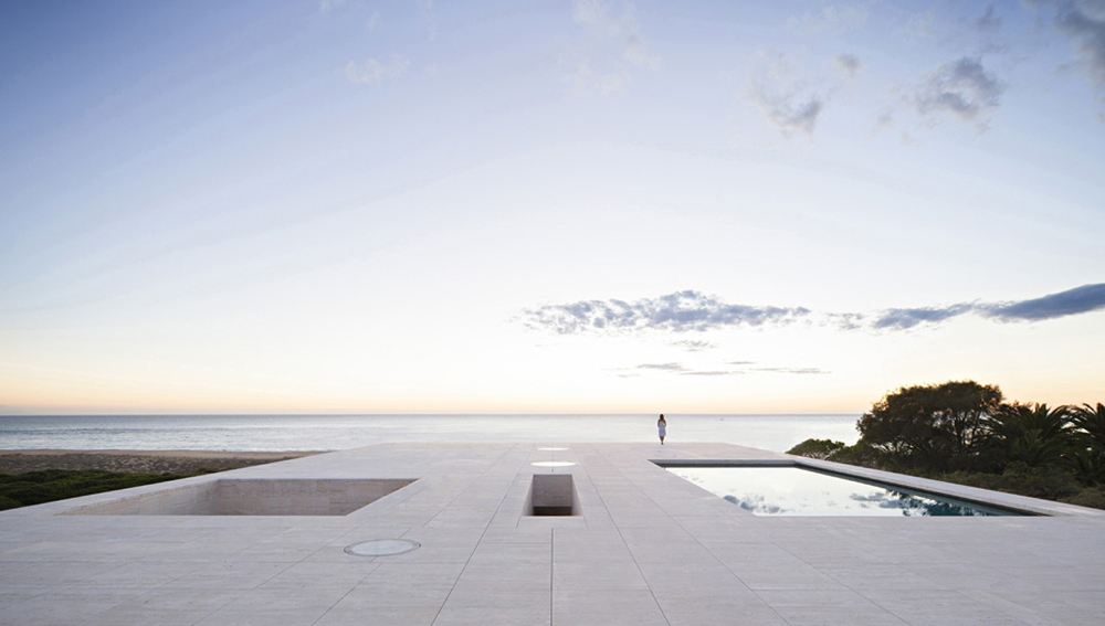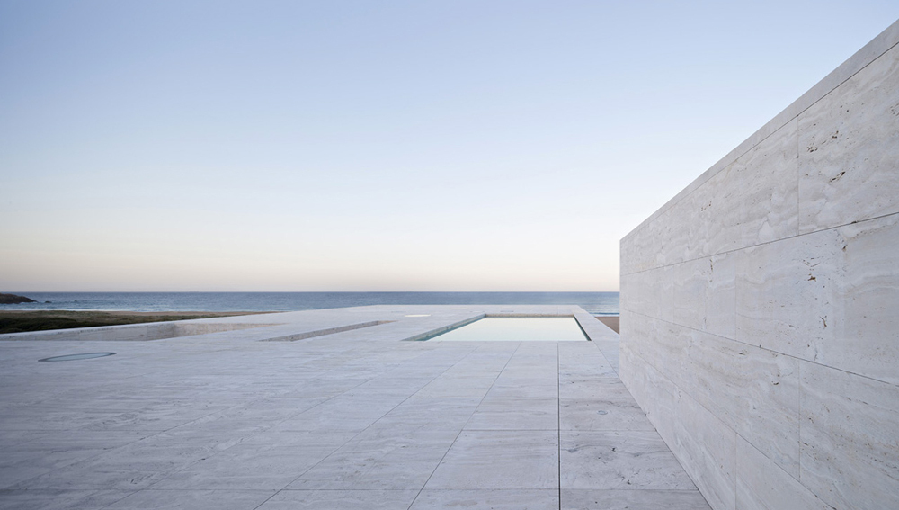 Acolo am inaltat o casa ca un dig inspre mare. O casa care este ca un pódium incununat de un plan orizontal. Pe acest rezonant plan orizontal, goi si desculti, ne confruntam cu linia orizontului distant, trasata de catre mare acolo unde apune soarele. Planul orizontal inaltat in piatra, travertin roman, ca si cand ar fi nisip, un plan infinit catre marea infinita. Nimic mai mult, nimic mai putin.