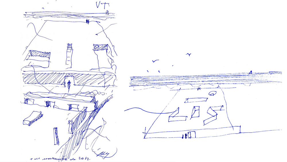 Exista o gravura minunata de Rembrandt din 1655, "Cristos aratat poporului", care m-a fascinat intotdeauna. In ea, Rembrandt schițeaza o linie orizontala dreapta. Perfect dreapta și perfect orizontala. Este granita podiumului puternic, podiumul pe care are loc scena. Acolo, asa cum facea mereu Mies, se transforma planul intr-o linie. Sunt sigur ca lui Rembrandt si Mies le-ar placea casa noastra pódium, toata un pódium, numai un pódium. Asa si lui Adalberti Libera, care a facut acelasi lucru atunci cand a construit casa Malaparte din Capri. Si noua ne place. Atunci cand privim casa noastra de pe plaja, ne amintim de ei.